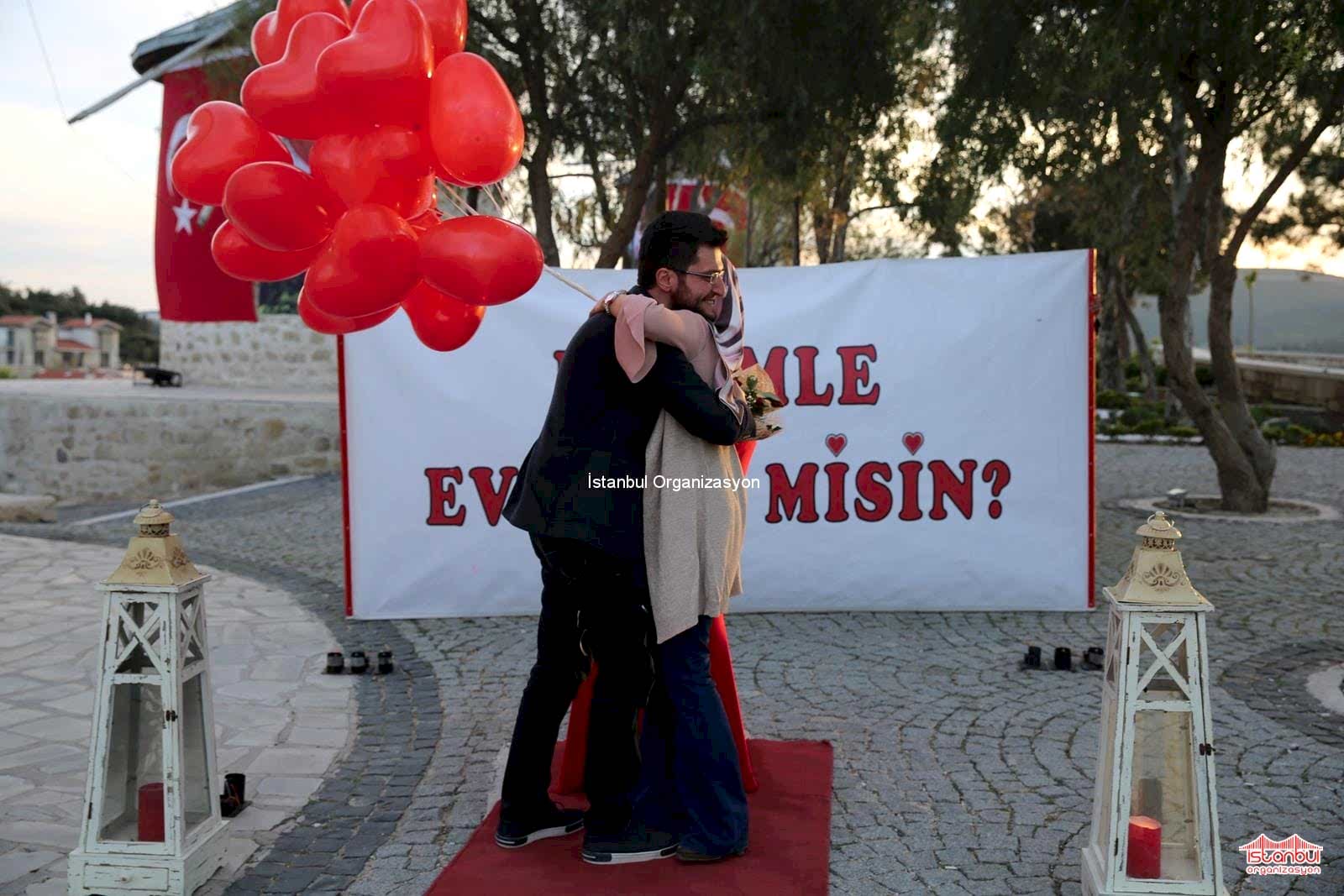 İstanbul Organizasyon ekibimiz Cansu Hanım ve Burak Beyi beklerken, çiftimiz de el ele tutuşarak bize doğru geliyordu. Ekip arkadaşımız uçan balonları Cansu Hanım’a iletti. Yer volkanları eşliğinde kırmızı halıdan yürüyen çiftimiz uzun uzun birbirine sarıldı. Ardından ise Burak Bey diz çökerek ‘Benimle Evlenir Misin’ diye sordu Cansu Hanıma. ‘Evet‘ cevabı ile bir kez daha yer volkanları ateşlendi. Uçan balonları gökyüzüne bırakan çiftimiz dans ederek romantik dakikalar yaşadı. Çiçek buketini Canan Hanım’a takdim eden Burak Bey ardından eş adayı ile fotoğraf çektirerek bu anları ölümsüzleştirdi. Alaçatı Yel Değirmenlerinde sürpriz evlilik teklifi organizasyonu ile İstanbul Organizasyon firmamız bir kez daha unutulmayacak anlara imza attı. Evlilik teklifi organizasyonu ile ilgili ayrıntılı bilgi almak için evlilikteklifi.com sitemizi ziyaret edebilir ya da İstanbul Organizasyon firmamıza ulaşabilirsiniz.