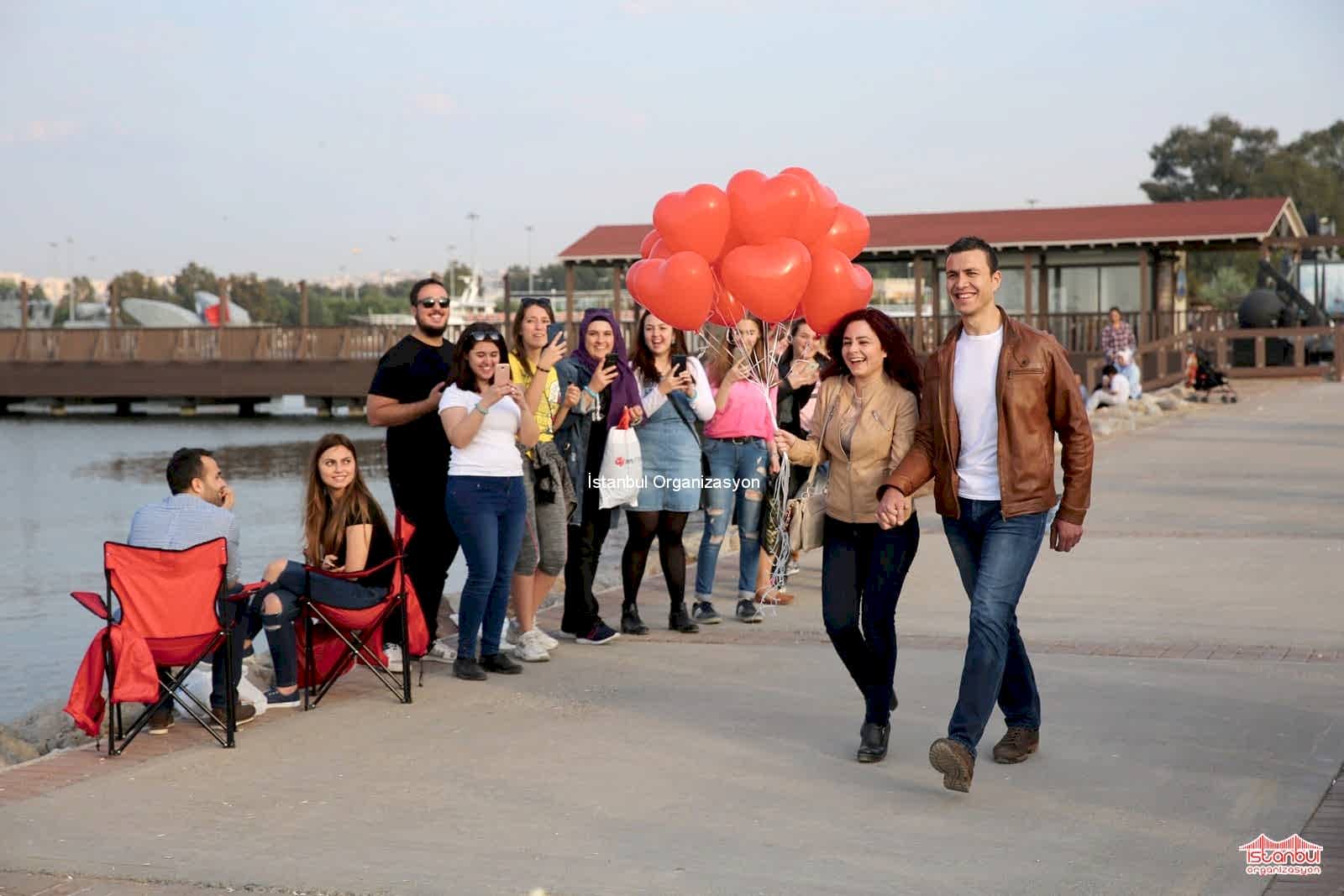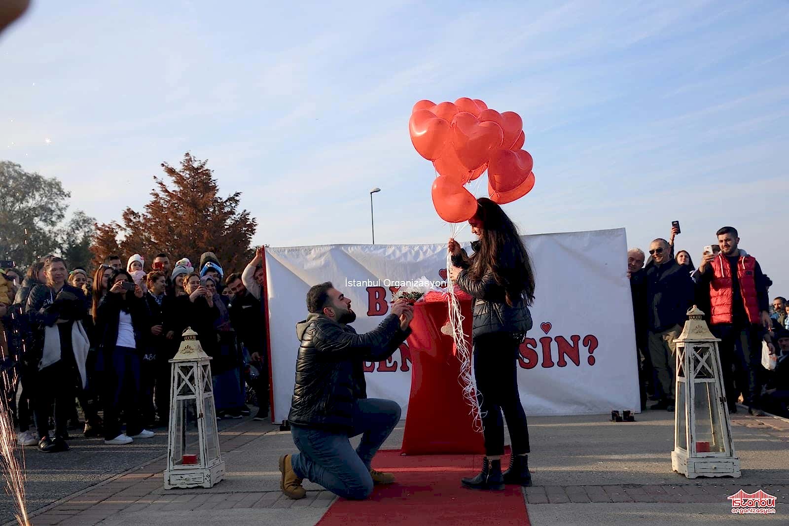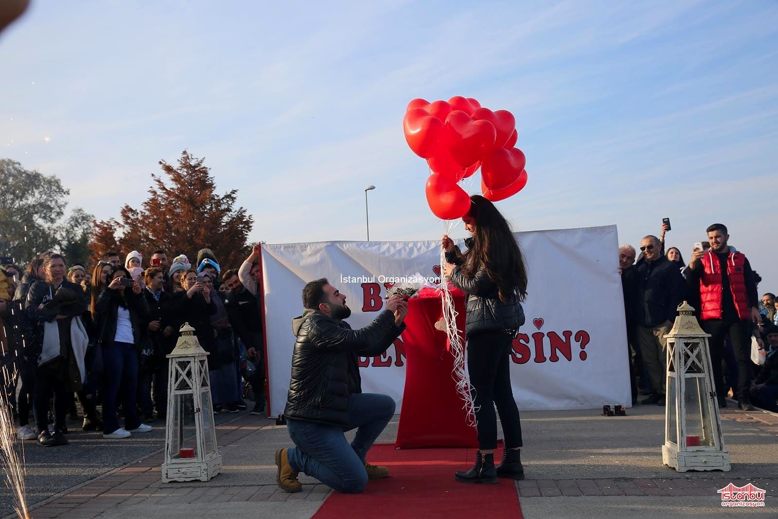 Belirlediğimiz lokasyona ulaştığınızda organizasyon sorumlumuz elinde uçan balonlar ile sizi bekliyor olacak. Sevdiğiniz kadının organizasyona dair en ufak bir fikri olmadığı için sadece oradan geçeceğinizi düşünecek ta ki uçan balonlar kendisine verilene kadar. İşte her şey bu an itibariyle başlamış olacak. Fonda eş adayınız ile dinlemekten en çok zevk aldığınız romantik bir şarkı… Rüya gibi bir atmosferin içerisinde unutulmayacak anlar yaşayacaksınız. Uçan balonları aldıktan sonra yüzündeki mutluluk ve şaşkınlık ile size bakan sevdiğiniz kadına tam da bu esnada dev pankartta yazan ‘Benimle Evlenir Misin‘ sorusunu bir kez de canlı canlı dile getirebilir ve ‘Evet’ cevabı ile birlikte ona sarılabilirsiniz.