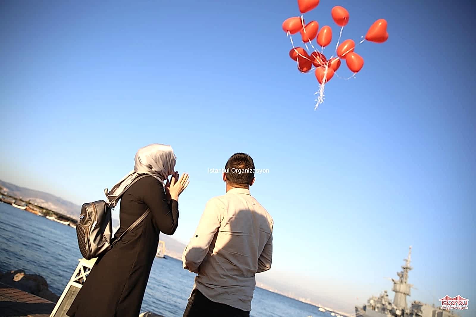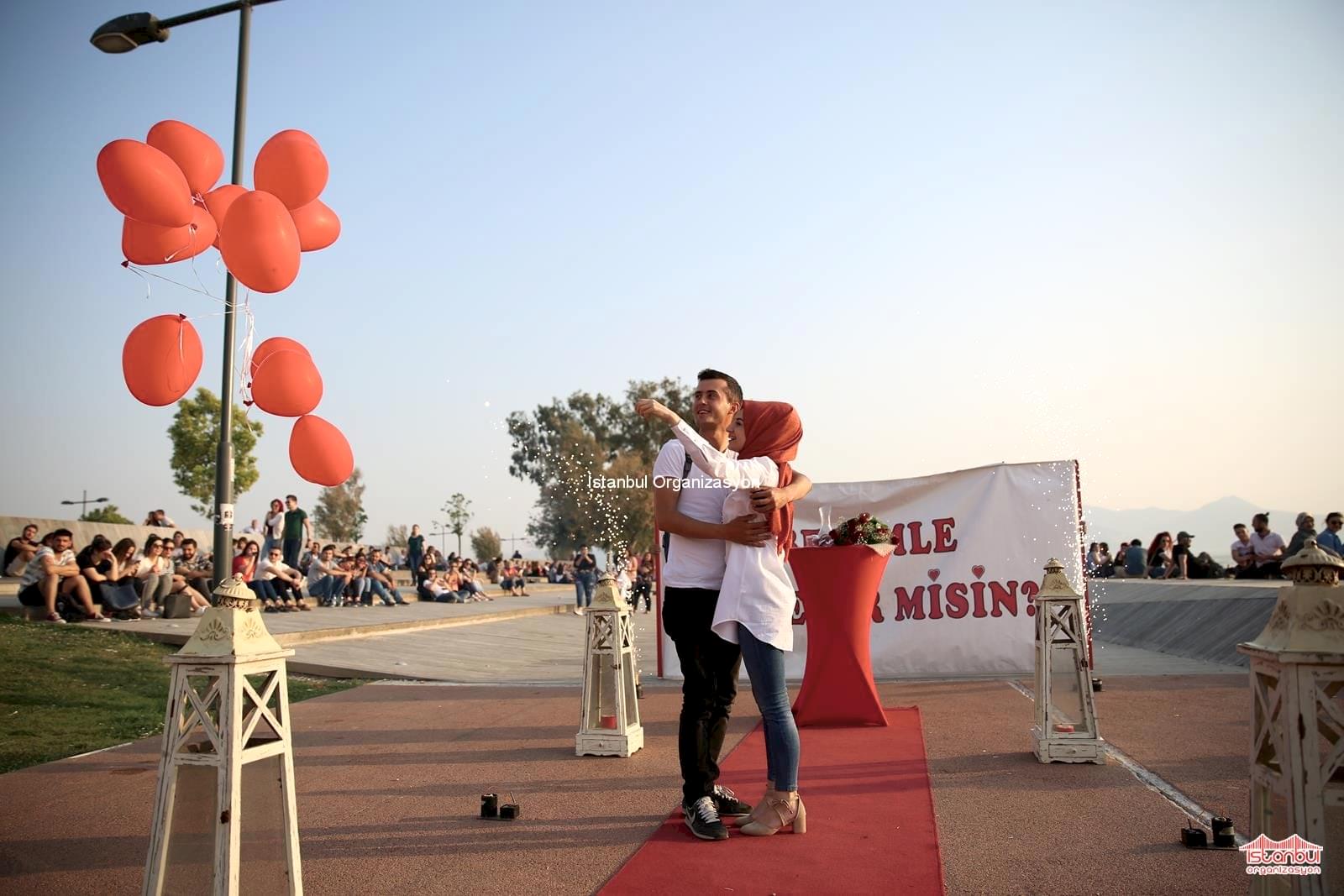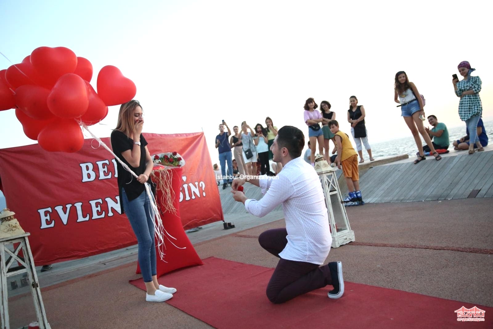 Belirlediğimiz lokasyona ulaştığınızda organizasyon sorumlumuz elinde uçan balonlar ile sizi bekliyor olacak. Sevdiğiniz kadının organizasyona dair en ufak bir fikri olmadığı için sadece oradan geçeceğinizi düşünecek ta ki uçan balonlar kendisine verilene kadar. İşte her şey bu an itibariyle başlamış olacak. Fonda eş adayınız ile dinlemekten en çok zevk aldığınız romantik bir şarkı… Rüya gibi bir atmosferin içerisinde unutulmayacak anlar yaşayacaksınız. Uçan balonları aldıktan sonra yüzündeki mutluluk ve şaşkınlık ile size bakan sevdiğiniz kadına tam da bu esnada dev pankartta yazan ‘Benimle Evlenir Misin‘ sorusunu bir kez de canlı canlı dile getirebilir ve ‘Evet’ cevabı ile birlikte ona sarılabilirsiniz.