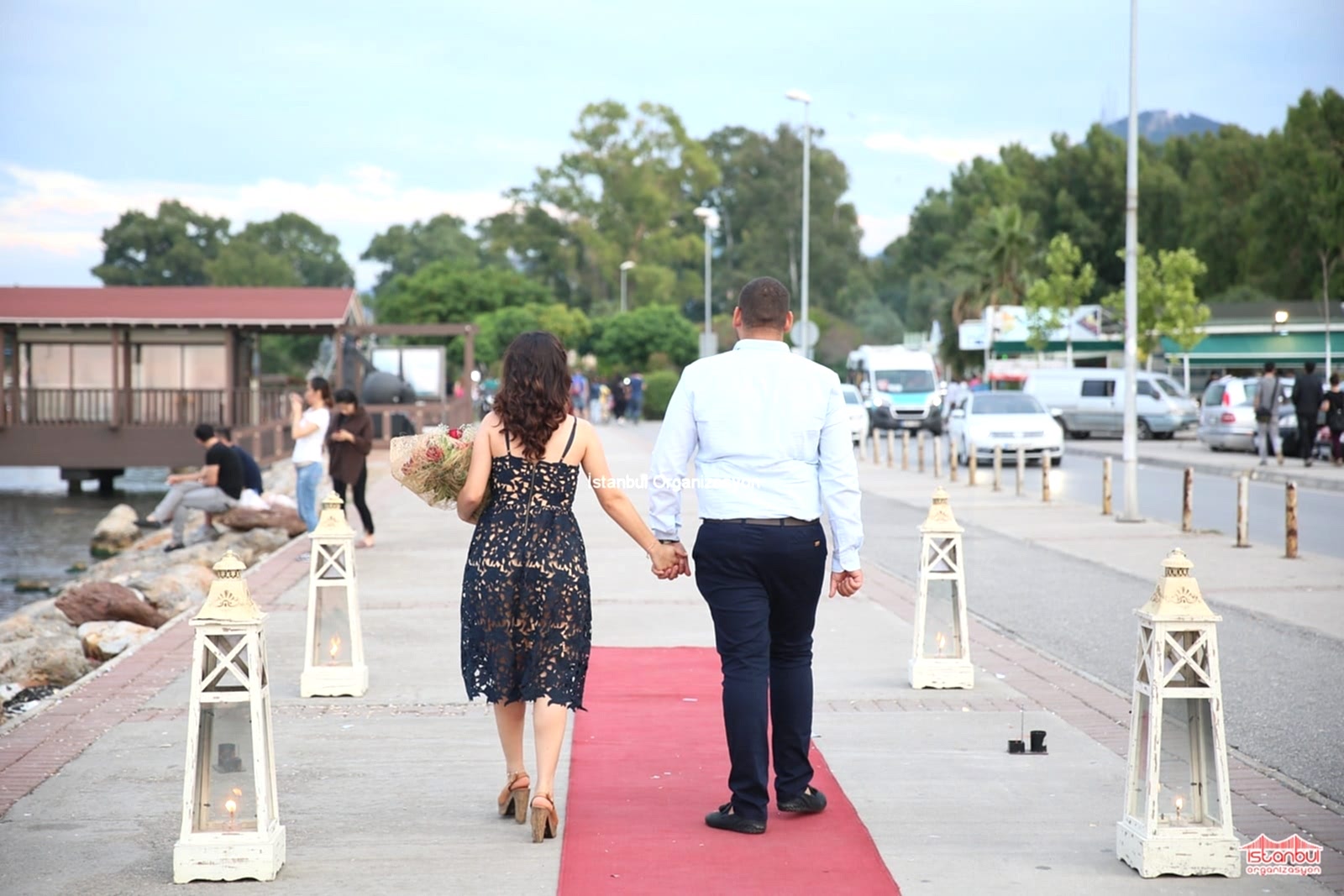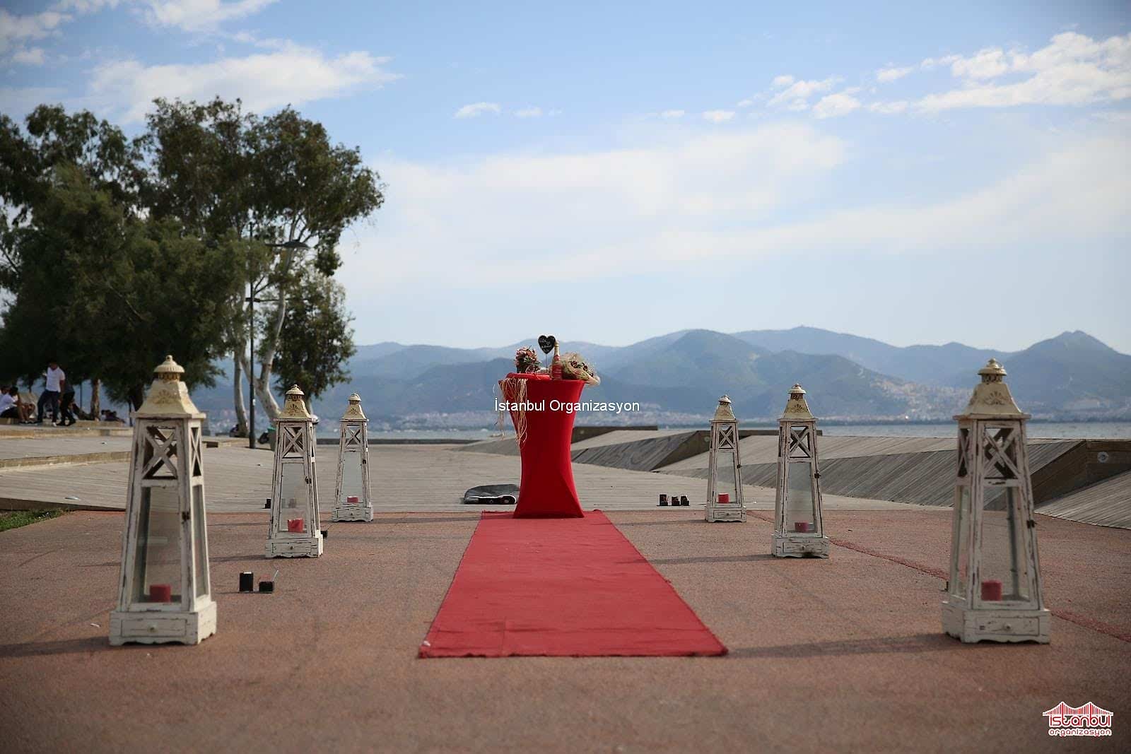 Çiftiniz ile birlikte yürüyeceğiniz kırmızı halı ile yürüyüş yolu hazırlanarak yer volkanları ve denizci fenerleri yolun iki yanında belirli aralıklarla konumlandırılıyor. Sizin için özel olarak hazırladığımız çiçek buketi ve alkollü ya da alkolsüz olarak tercih edebileceğiniz içeceğiniz bistro masanın üzerine özenle yerleştirildikten sonra alandaki son kurulumlar tamamlanıyor. Siz alana giriş yaptığınız anda çalmaya başlayacak olan şarkı için ses sistemi ve jeneratör de hazırlanıyor. Son olarakta pankartımız ve uçan balonlarımız tamamlanıyor. Siz gelmeden önce ise alanın fotoğraf ve video çekimleri tamamlanıyor. Son kontrollerimiz yapıldıktan sonra ise organizasyon alanına geleceğiniz anı bekliyoruz.