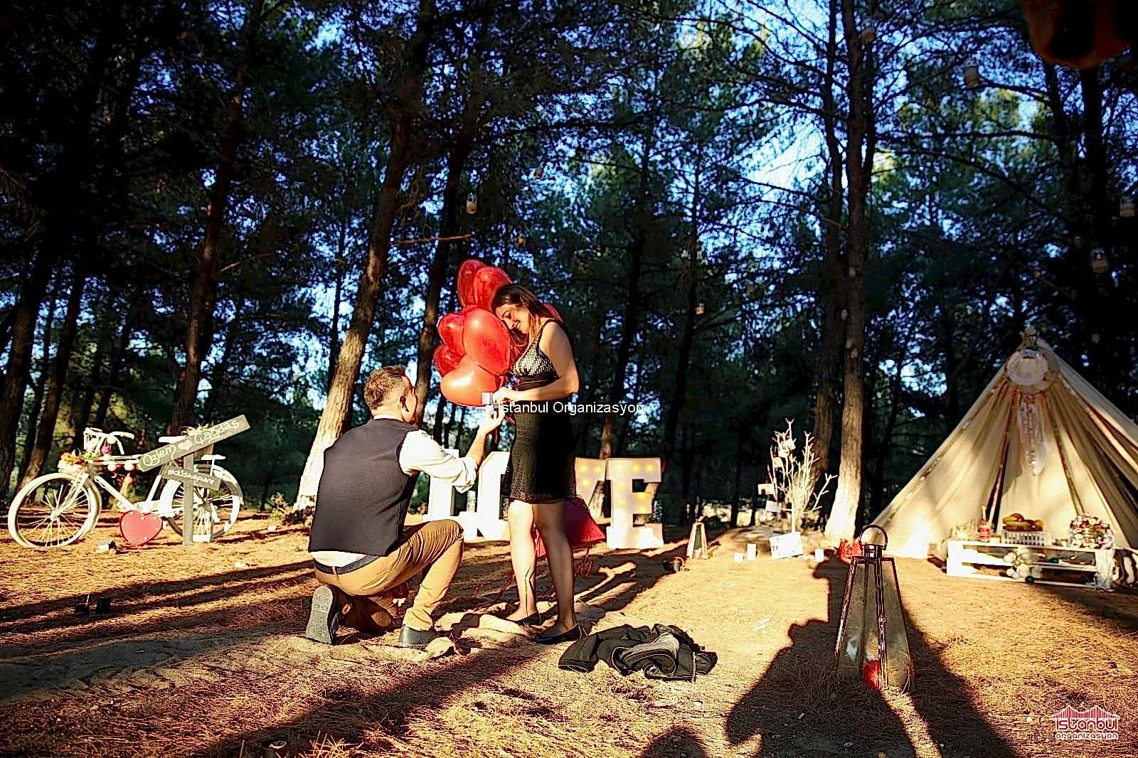 Düş kapanı evlilik teklifi organizasyonunuz için, planladığımız saatten ortalama üç saat önce kurulum başlar. Önce yürüyüş yolunuz oluşturulur. Girişe istediğiniz renkte halınız, uzaktan kumandalı yer volkanlarınız, fenerleriniz, mumlar, kandil lambaları, odunsu objeler, su bambularıyla hazırlanan Kızılderili üçgen çadırınız ve vakit geçireceğiniz snaek ikramlıklar yer alır. Tabi ki de o günü kutlamak adına patlatacağınız şampanyanız soğutulmuş ve kişiye özel tasarımıyla sizleri masanızda bekliyor olacaktır. Bulunduğumuz alan ormanlık bir bölge olduğu için ışıklandırmalar oldukça önemlidir. Ağaç aydınlatmaları, dev love ışıklı tabelası ve etrafta sizin daha önce sevdiğinizle çekilmiş fotolarınız bu evlilik teklifinize kimliğinizi koyacaktır. Diğer tüm detaylar siz ve sevgiliniz için İstanbul Organizasyon ekibimiz tarafından eksiksiz hazırlanıyor. Gün batımı yaklaşırken kurguladığımız gün haberleşip hazırız onayını alıp sizleri organizasyon alanına davet ediyoruz.