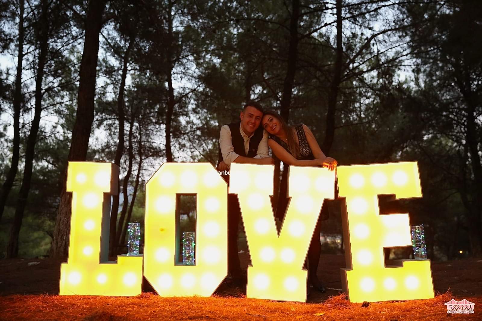 - Dev Love Işıklandırma: Romantik mi, ilginç mi, yoksa şık bir şey mi? Bizde adını koyamadık. 110 cm yüksekliğinde aşkınızı ingilizce kelime ile yansıtacak, özel renkleriyle gün ışığını evlilik teklifi organizasyonunuza yansıtacak, tarz katacak en farklı, en sıra dışı ışıklandırma panosudur.