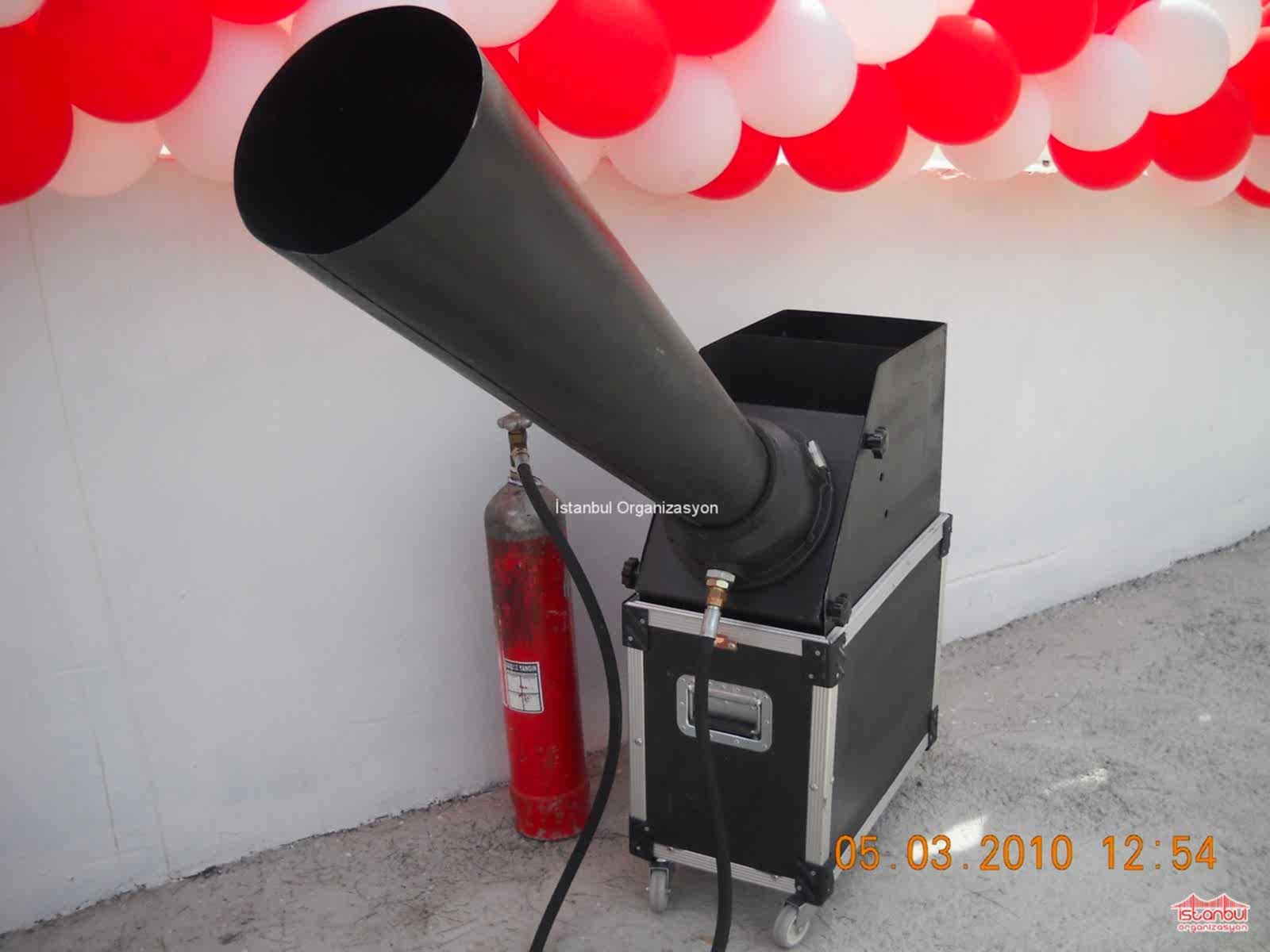 - Gazlı Konfeti : Gazlı konfeti, karbondioksit gazı ile çalışan pro teknik bir makinedir. 170 cm x 40 cm x 80 cm ve 120 cm x 35 cm x 70 cm ölçülerinde olan farklı boyutları mevcuttur. İçerisine isteğe göre gramajı ayarlanabilen renkli ve parlak kağıtlar konulur. Kağıtların püskürtüleceği mesafe ayarlanır. Karbondioksit gazının basıncıyla kağıtlar havaya püskürür ve gösteri başlamış olur. İsteğe göre kağıtların gideceği mesafe 3 metre ile 15 metre arasında ayarlanabilir. organizasyon mekanının uygunluğu, organizasyonun büyüklüğü ve davetli sayısı gibi faktörlere bağlı olarak gazlı ayarlamalar yapılabilir.