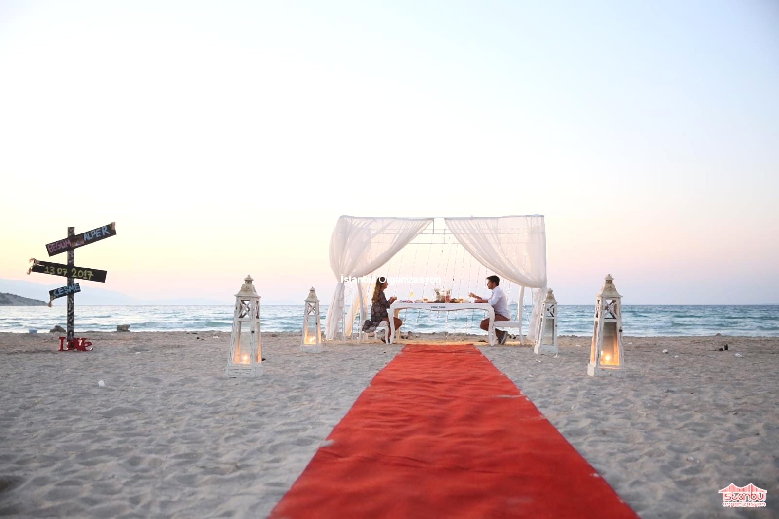 Kumsalda evlilik teklifi organizasyonu için sayılı gün çabuk geçmişti. İstanbul Organizasyon ekibimiz tüm hazırlıkları bir gün öncesinden hazırlamış ve ekipmanları da araçlarımıza yüklemişti. Organizasyon tarihi geldiğinde Çeşme’ye doğru yola çıkarak organizasyondan yaklaşık 4 saat önce alana ulaştık. İlk olarak beyazla bezenmiş gazebomuzu kurmak için çalışmalara başladık. Uzun bir temponun ardından gazebomuzu kurarak tül süslemelerini tamamladık. Arka kısmında yer verecek şekilde ledli ışıklarımızı da hazır hale getirdik. Teknik ekibimiz gazebonun içerisinde yer vereceğimiz masa ve sandalyeyi yerleştirdikten sonra alandaki diğer hazırlıklara başlamıştı. Ses sistemi, yürüyüş yolu ve diğer birçok hazırlık tamamlandı. Organizasyon sorumlumuz da Begüm ve Alper çifti için özenle masayı süslüyordu. Son olarak yönlendirme tabelalarımız da kumsalda yerini aldı. Kontrollerimizi yaptıktan sonra gün boyunca iletişimde kaldığımız Alper Beye organizasyonun tamamladığını söyledik. Alper Beyden de yolda olduklarını ve birkaç dakika içerisinde alana ulaşacaklarını söyleyen mesaj geldiğindeyse hepimiz yerlerimizi aldık.