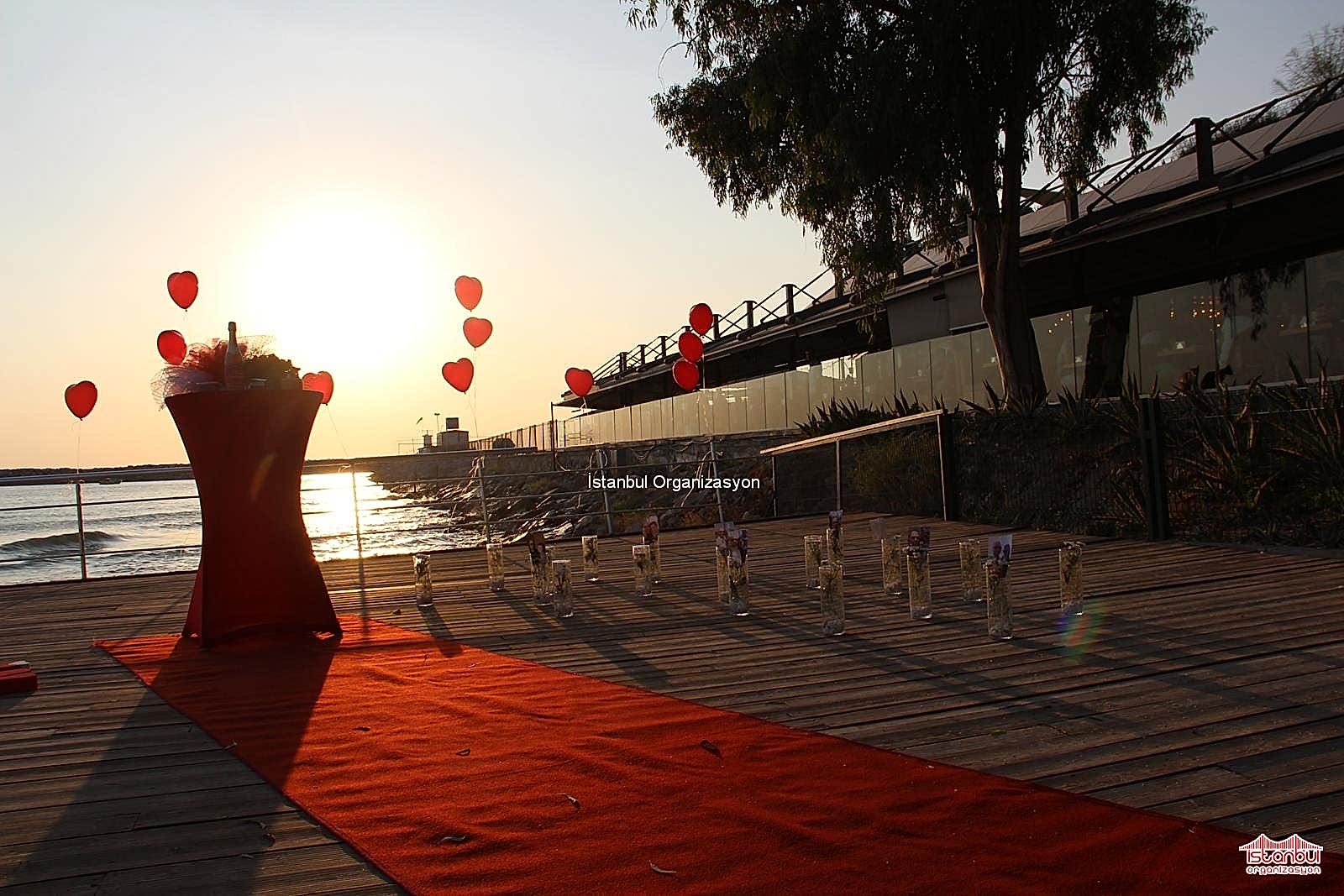 Kuşadası iskelede evlilik teklifi organizasyonu için takvimlerden yaprakları bir bir koparıp organizasyon gününe geldiğimizde İstanbul Organizasyon ekibimiz Kuşadası’na gitmek üzere hazırlıklarını tamamlamıştı. Organizasyondan yaklaşık 3 saat önce belirlediğimiz lokasyona ulaştık. Bu süre zarfında Mert Bey ile iletişimde kalmaya devam ettik. Ekibimiz iskeleye ekipmanlarımızı özenle götürerek hemen hazırlıklara başladı. Kırmızı halıyı çiftimiz için yere serdik. Yanlarına ise eskitilmiş ahşap denizci fenerlerini ve yer volkanlarımızı yerleştirdik. Cam vazolarımızın içerisini ise Sinem Hanımın sevdiği çiçeklerle yani papatyalarla süsledik. Yürüyüş yolunun sonunda bistro masamızı konumlandırarak üzerine çiftimiz için kadehleri, şampanyayı, çiçek buketini ve Sinem Hanıma hediye etmek üzere müzik kutusunu yerleştirdik. Teknik ekibimiz ses sisteminin kurulumunu tamamladı ve ‘Benimle Evlenir Misin’ yazılı strafor harfler bistro masanın yanında yerini aldı. Tırabzanlar da kırmızı kalpli balonlarımızı da hazırladıktan sonra hemen hemen her şey tamamlanmıştı. Son olarak Sinem Hanıma takdim etmek üzere uçan balonlarımız hazırlandı. Hazırlıklarımızı bitirdikten sonra son kontrollerimizi yaptık.