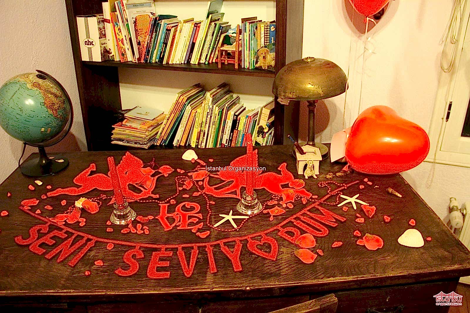 Denizci fenerleri kapının girişinde sizi karşılayacak şekilde kırmızı mumlar ile romantik bir atmosfer yaratıyor. Kalp şekilli süsler yatağın üzerinde, odanın müsaitlik durumuna göre farklı bölümlerde yerini alıyor. Uçan balonlar da odada en uygun noktalara yerleştiriliyor. ‘Benimle Evlenir Misin‘ yazılı strafor harfler odadan girdiğinizde göreceğiniz şekilde ( odanın durumuna göre değişiklik gösterebilir ) konumlandırılıyor. Daha pek çok üründe organizasyon sorumlumuz tarafından odada hazır hale getiriliyor. Biz hazırlıklarımızı tamamlayıp organizasyon saati gelmeden önce ekibimiz ile birlikte organizasyon alanından ayrılıyoruz.