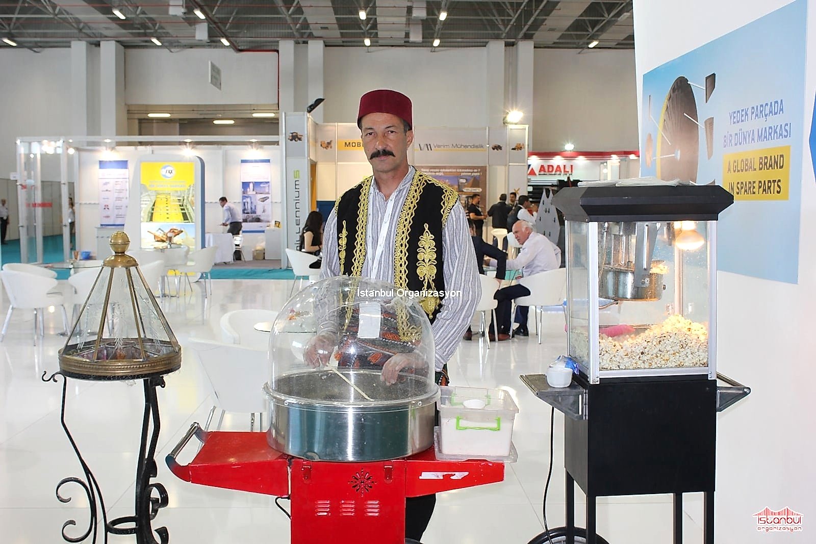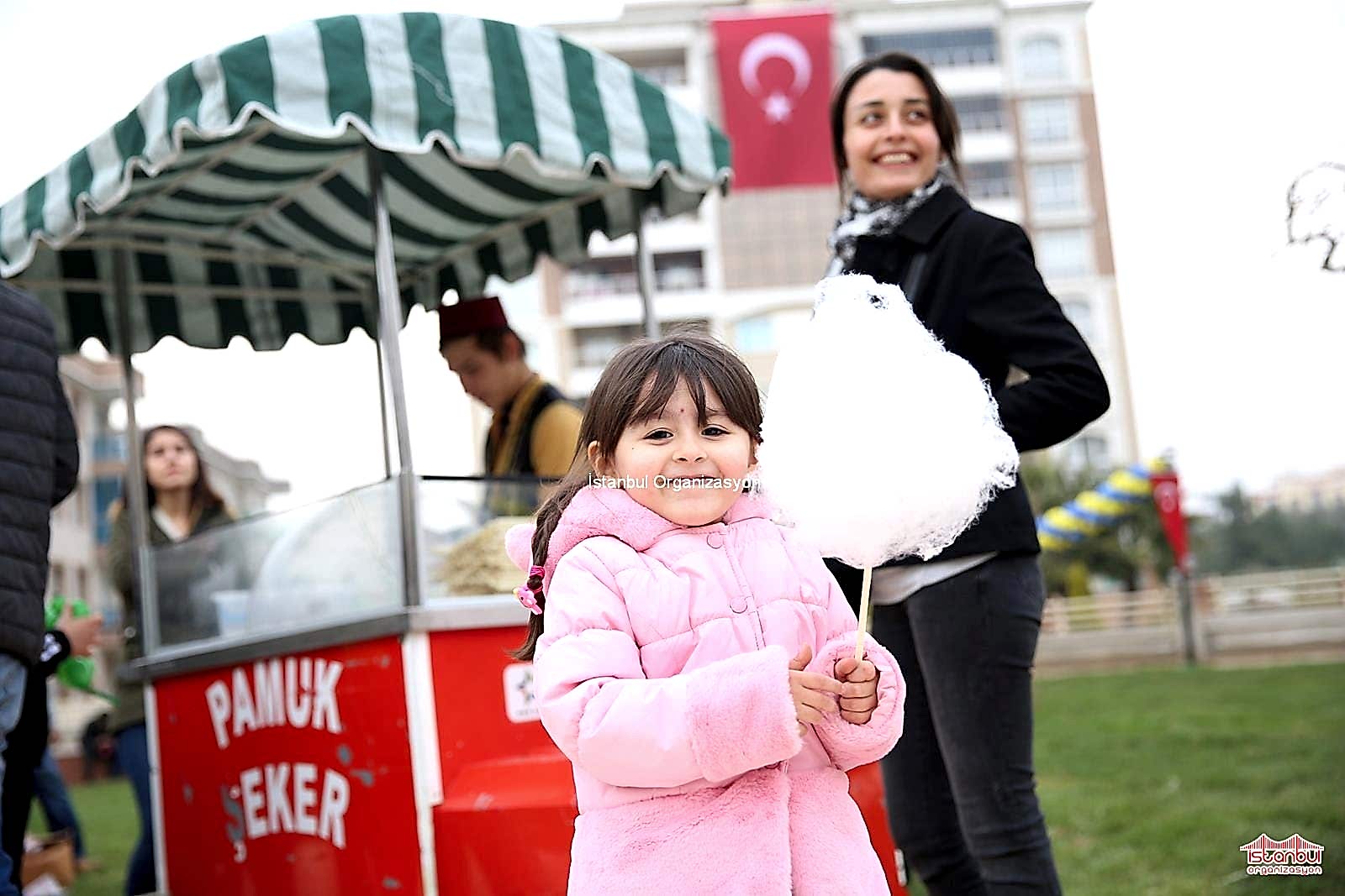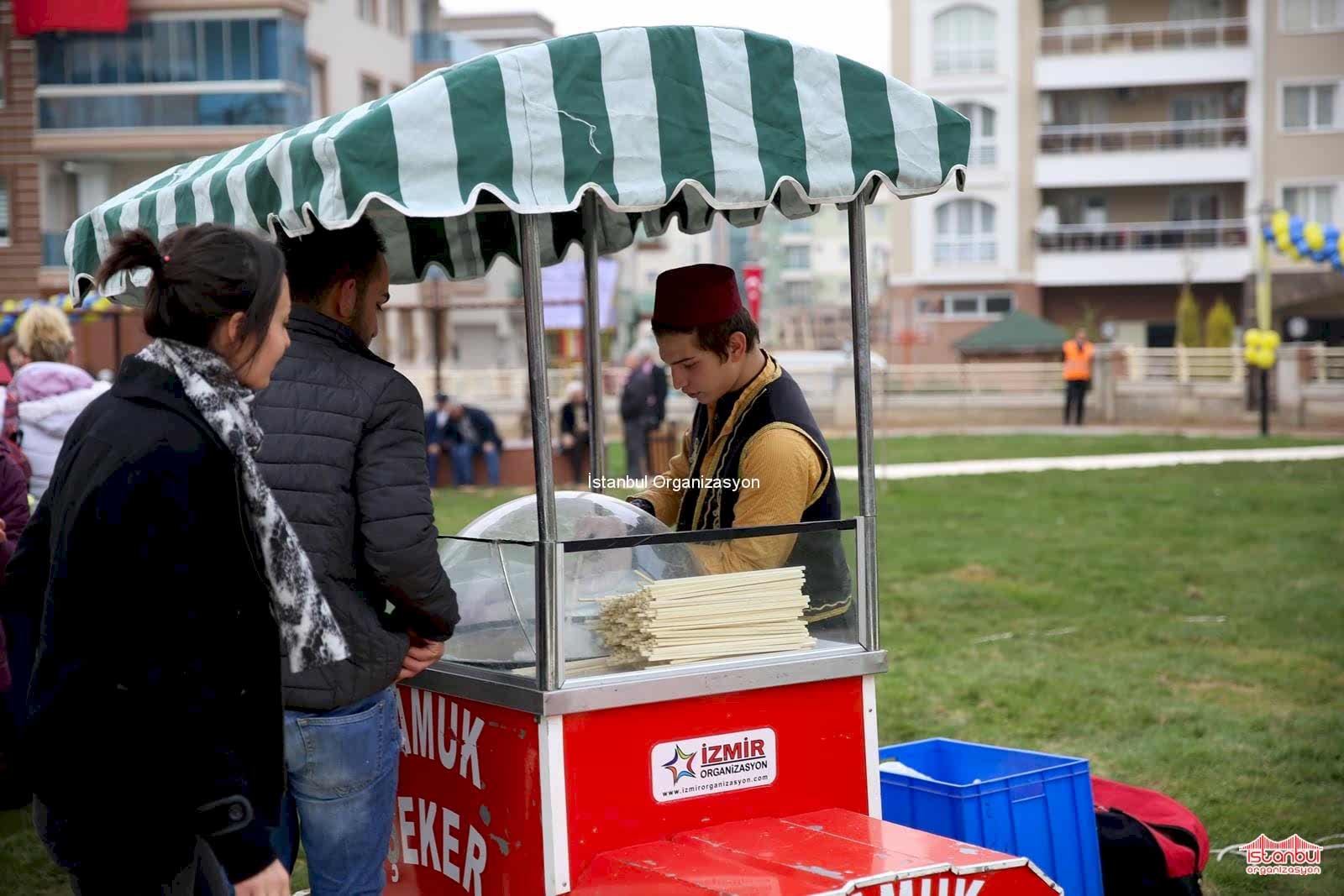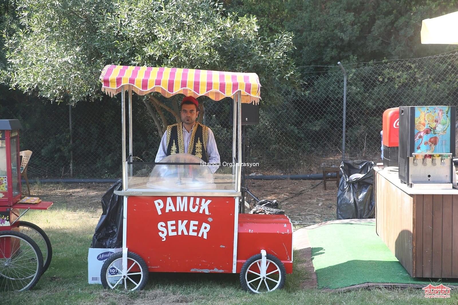 Pamuk şeker; doğum günü, AVM etkinlikleri, piknikler, şenlik ve festival gibi organizasyonlarda verdiğimiz nostaljik satıcı hizmetidir. Pamuk şeker yapımında sağlığa uygun gıdasal ürünler kullanılmakta olup, yapımından sunumuna kadar olan tüm hizmet tarafımızca sizlere sunulmaktadır. Eğlence organizasyonlarını daha eğlenceli ve keyifli hale getiren pamuk şekercimiz, organizasyon konseptine uygun olarak hazırladığı pamuk şekerci arabasını ( makinesini ), etkinlik mekanında hazırlar. Davetlilerinizin huzurunda pamuk şekerini pişirir ve manilerle sunar. Pamuk şekerlerinin sunumunu yöresel kostümleriyle yapan pamuk şekercimiz, organizasyon konseptinize göre de kostümünü değiştirir. Örneğin kurumsal organizasyonlarınızda firmanıza ait tişört giyebilir ya da eğlence organizasyonlarında animasyon karakterine dönüşebilir. Başta İstanbul ve yakın çevresi olmak üzere, İstanbul Anadolu yakası, İstanbul Avrupa yakası, Marmara Bölgesi, Ege Bölgesi ve Türkiye’nin her yerinde gerçekleştireceğiniz eğlence organizasyonlarınızda , İstanbul Organizasyon olarak pamuk şekerci ve çeşitli sokak satıcıları hizmeti veriyoruz.