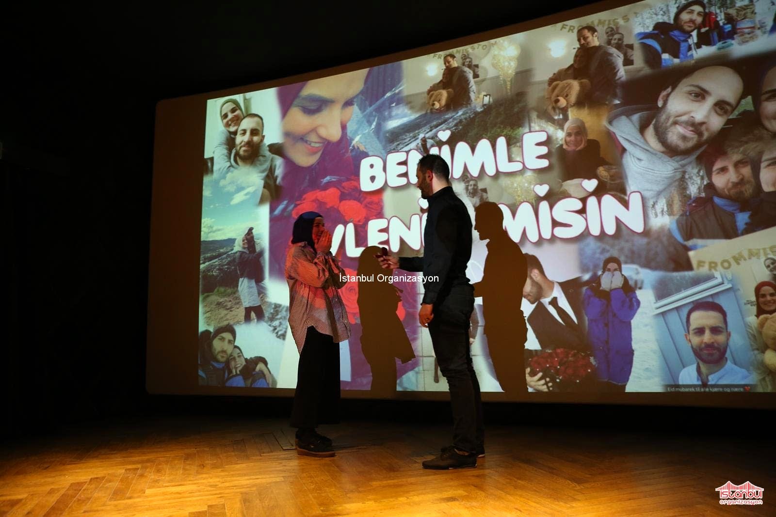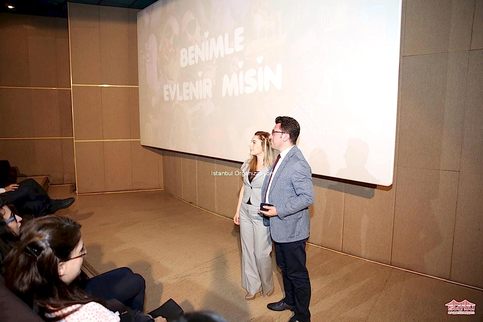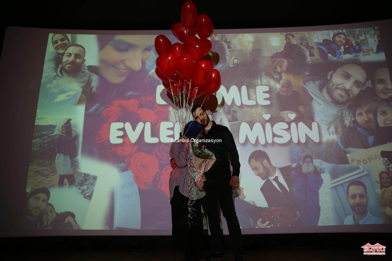 Filmin başlayacağı saat yaklaştığında ise alana gelmeden önce son kontrollerimizi yapıyoruz. Gişeden daha önce sizin için ayırmış olduğumuz biletleri alarak film gösteriminin olduğu yere yöneliyorsunuz. Tamamıyla sürpriz olacak bu organizasyon için salona geldiğinizde koltuklarınıza oturarak filmi izlemeye başlıyorsunuz. Bu sırada ise gizli kamera ve fotoğraf çekimleri ile anbean görüntülenmeye devam ediyorsunuz. Filmin ilk yarısı tamamlandığında içecek almak üzere salondan dışarı çıktığınız da sizin için hazırladığımız video klibi filmin ikinci yarısında gösterime başlamak üzere planlamaya alıyoruz. İçeriği girip yerlerinize oturduğunuzda ise salonun ışıkları kapanıyor. Beyaz perdede sizin için hazırladığımız ve başrollerinde sizin yer aldığınız video klip gösterime başlıyor. Bu anlarda sevdiğiniz kadın büyük bir şaşkınlık içerisinde klibi izlerken ‘Benimle Evlenir Misin‘ yazısı gözüküyor ekranda. Eş adayınızın elinden tutarak ekranın önüne geliyor ve heyecanla beklediğiniz soruyu bir kezde siz soruyorsunuz. ‘Evet‘ cevabı ile birlikte ise sevdiğiniz kadına sıkı sıkı sarılıyorsunuz.