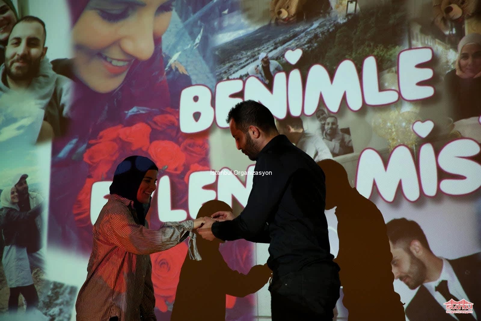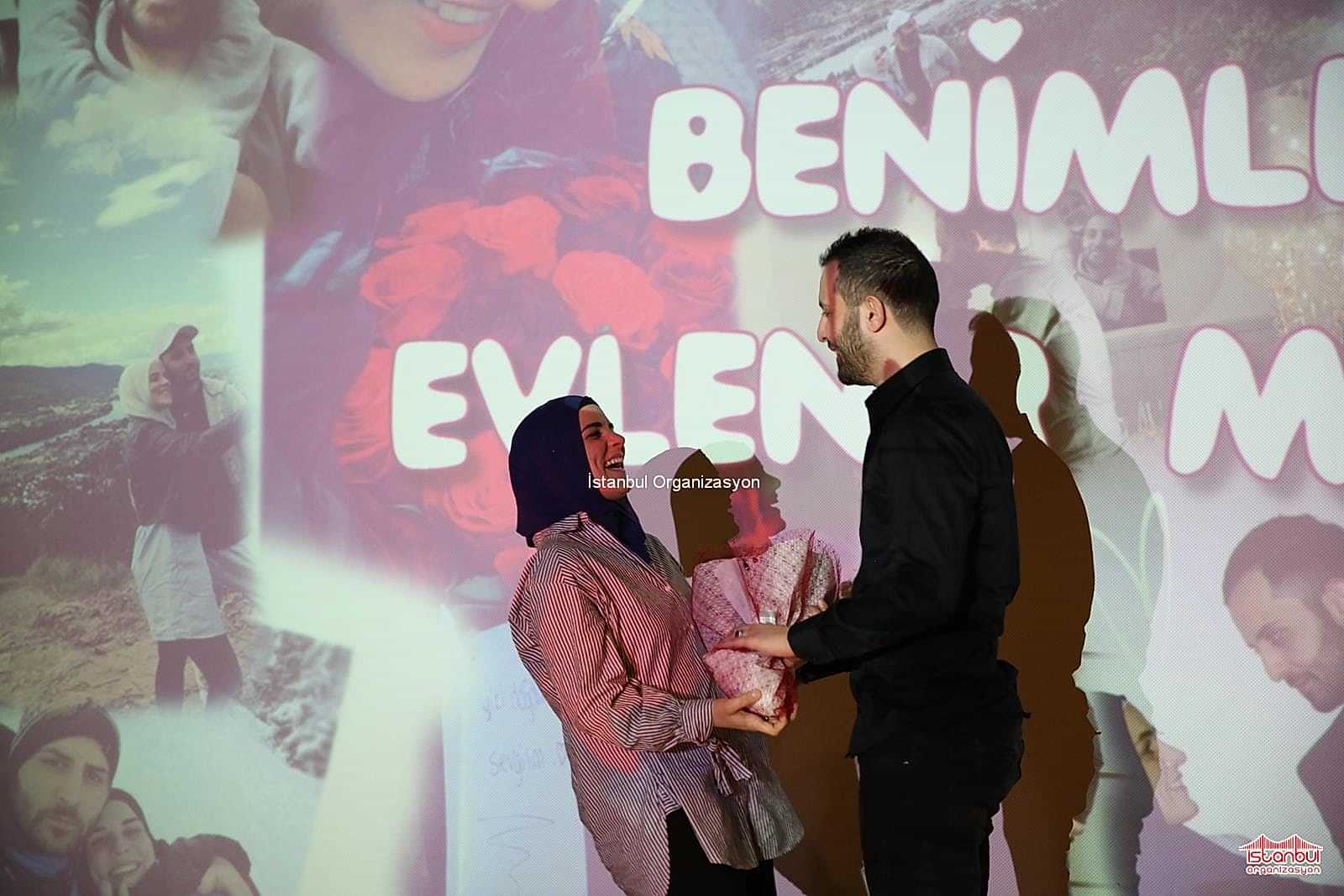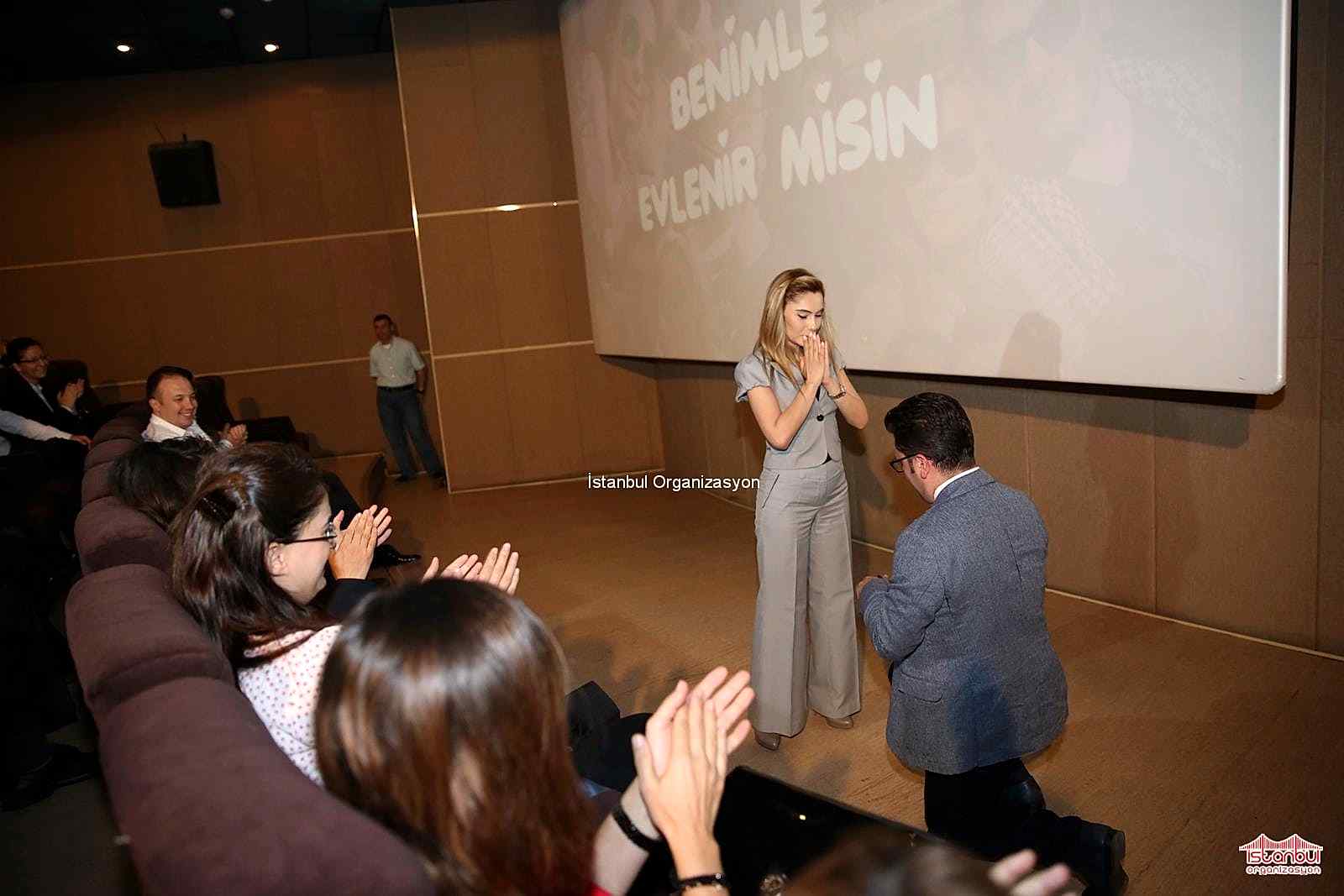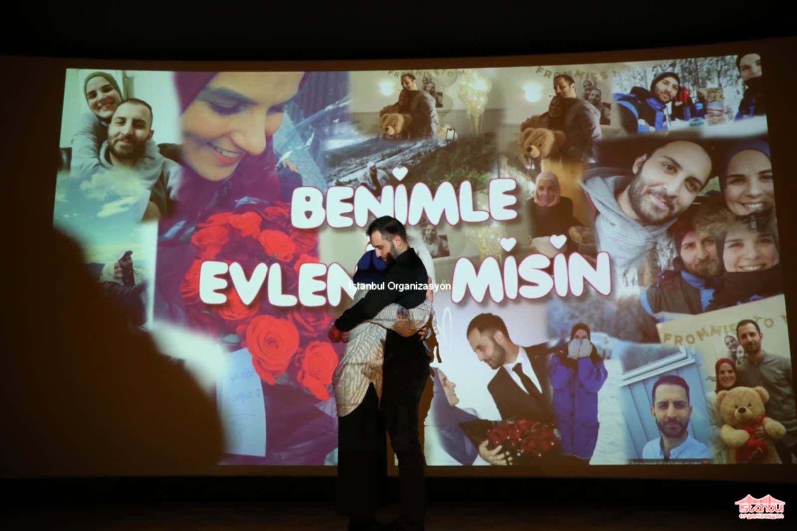 Filmin başlayacağı saat yaklaştığında ise alana gelmeden önce son kontrollerimizi yapıyoruz. Gişeden daha önce sizin için ayırmış olduğumuz biletleri alarak film gösteriminin olduğu yere yöneliyorsunuz. Tamamıyla sürpriz olacak bu organizasyon için salona geldiğinizde koltuklarınıza oturarak filmi izlemeye başlıyorsunuz. Bu sırada ise gizli kamera ve fotoğraf çekimleri ile anbean görüntülenmeye devam ediyorsunuz. Filmin ilk yarısı tamamlandığında içecek almak üzere salondan dışarı çıktığınız da sizin için hazırladığımız video klibi filmin ikinci yarısında gösterime başlamak üzere planlamaya alıyoruz. İçeriği girip yerlerinize oturduğunuzda ise salonun ışıkları kapanıyor. Beyaz perdede sizin için hazırladığımız ve başrollerinde sizin yer aldığınız video klip gösterime başlıyor. Bu anlarda sevdiğiniz kadın büyük bir şaşkınlık içerisinde klibi izlerken ‘Benimle Evlenir Misin‘ yazısı gözüküyor ekranda. Eş adayınızın elinden tutarak ekranın önüne geliyor ve heyecanla beklediğiniz soruyu bir kezde siz soruyorsunuz. ‘Evet‘ cevabı ile birlikte ise sevdiğiniz kadına sıkı sıkı sarılıyorsunuz.